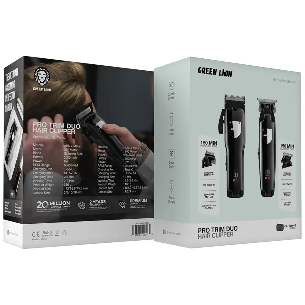 ضمان سنتين - مكينة الحلاقة +4+ رؤوس وتعمل لمدة 180 دقيقة - مكينة التحديد + 3 رؤوس وتعمل لمدة 150 دقيقة - اداة الموس - مقص عالي الجودة - فوطة - مشط - ادوات التنظيف